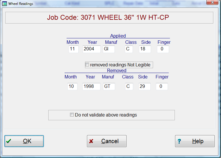 When a wheel repair is entered on the billing repair card entry screen and you move to the next line, the following screen will appear. This screen requires that the data be entered correctly. The month, year must be a logical entry. The system will verify that a correct Manufacturer and correct Class for the job code is entered. It will also validate that the side and finger readings are logical.