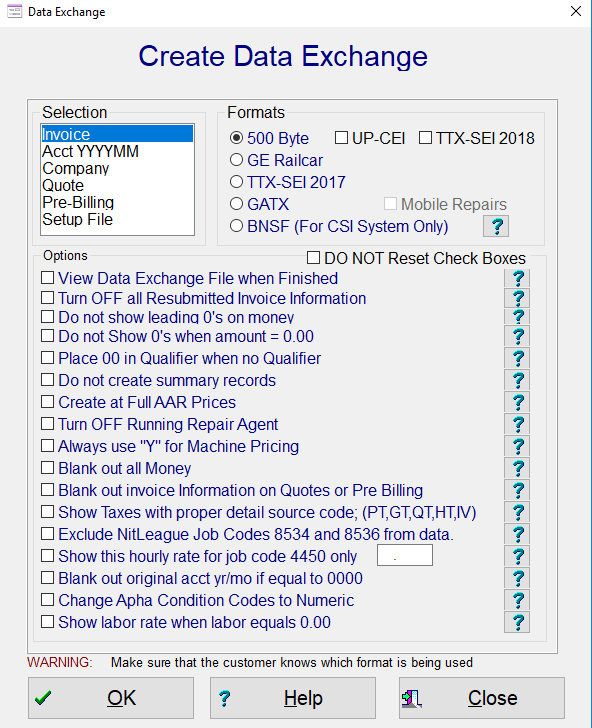 This screen will assist you in creating data exchange files for your customers. You simply make your selection on the left and then the format you what on the right. There are five formats to select from, AAR 500 Byte 2010, AAR 500 Byte 2009, GE Railcar, TTX Format, GATX with or without Mobile Repairs and BNSF CSI Format. There will be some companies that will not be able to unload the new format and therefore we have elected to keep this format. The AAR Old Format is the 160 byte format.