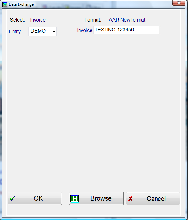If you select Invoice from the main screen and press the “OK” push button, the next screen that appears will be the invoice designation screen. The invoice number must be exactly as it is in the historical file. That includes spaces as well as any special marks, and it is case sensitive. If you are not sure, it is always best to select the push button “Browse”, which will show you a list of all invoices in the historical file. When you see the invoice you want, highlight it and press the return push button. When the screen above re-appears, the correct invoice number will be in the entry field. If you select Acct YYYYMM, a screen will appear asking for the accounting Year/Month. The invoice accounting period must be in YYYYMM format. Example 201007.