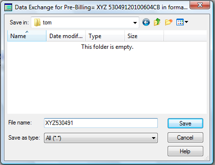 Once you have entered the correct invoice number above and pressed the “OK” push button, then the above screen will appear. This screen allows you to name the file whatever you want. The normal extension is .dat, but some like to use .txt. The file name can not be over 8 characters long plus the extension, and can not have any special characters. It can only contain letters and number with no spaces. If you want to select another drive, such as A:, then select it by using the Drive selection at the lower right. To move up or down directories with the drive you are in, double click on the directories on the right. Once you are finished, press the “OK” push button and the file will be saved as you have directed. If the same name is already present, the system will ask you if you want to overwrite the existing file.