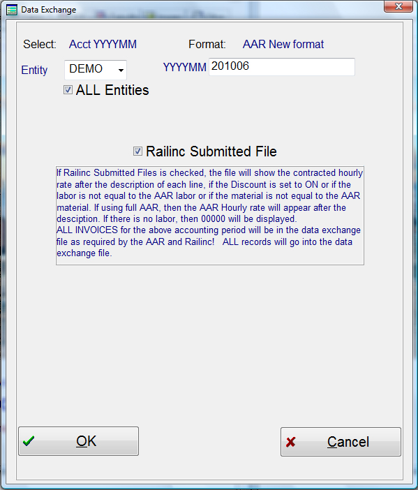 Effective January 1, 2009 Railinc will consider all errors, (including what is now considered non critical errors), as CRITICAL ERRORS and reject your entire file if any error exist! This include sending them data on companies that are not registered with them. This way when you designate in the Customer Profile of the Rolodex file what companies are classified as Railinc Submitted Files Only, then only those files will be created. The system will also ignore if you check “Do not write hourly rate on data exchange file”, as Railinc requires this entry. The hourly rate in your Customer Profile for each customer will be in each line of repair on the data exchange file where you have discounted the line and there is a labor charge. If you have not discounted the line, then the labor rate in the AAR Price Master for the date of repair will appear. If there is no labor charge, or the price master can not be found for that date, then 00000 will appear in your labor amount. Also, any special formatting such as TTX will be ignored and automatically be converted to the Railinc data exchange format. If your customer profile has the check box “Do not write hourly rate on data exchange file” checked and you create a data exchange file without the Railinc Submitted Files Only checked, then the labor amount will not appear in the file.