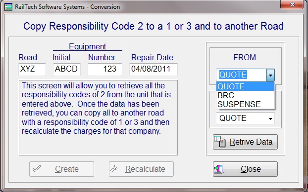 As the running repair agent, the only way for you to be paid by the railroad you represent, is to create the same bill with a 1 or 3 responsibility code and to bill that railroad. This utility will allow you to do that with a few clicks.